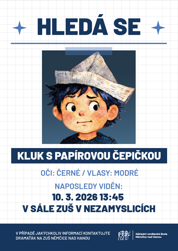 Rubriky Aktuality Hledá se kluk s papírovou čepičkou 10. 3.2026 Autor příspěvku Autor: admin Datum příspěvku 23 února, 2026 Hledá se kluk s papírovou čepičkou! Ale nebojte se, společně s vámi a s žáky dramaťáku jej můžeme najít na stejnojmenném divadelním představení, které proběhne v úterý 10. března ve 13:45 v sále ZUŠ Nezamyslice. ← Dětská scéna 23.01.2026 → Večer folklórní hudby 16. 3. 2026